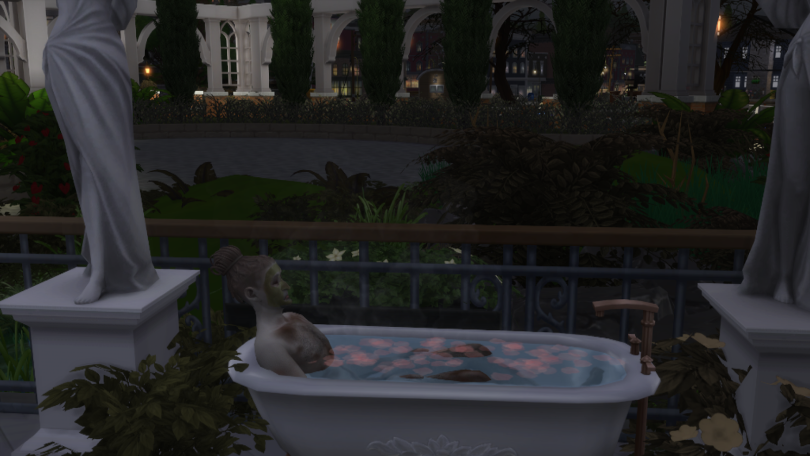 | Bah oui, Vlad prend un bain aux pétales roses lui en terrasse ... |